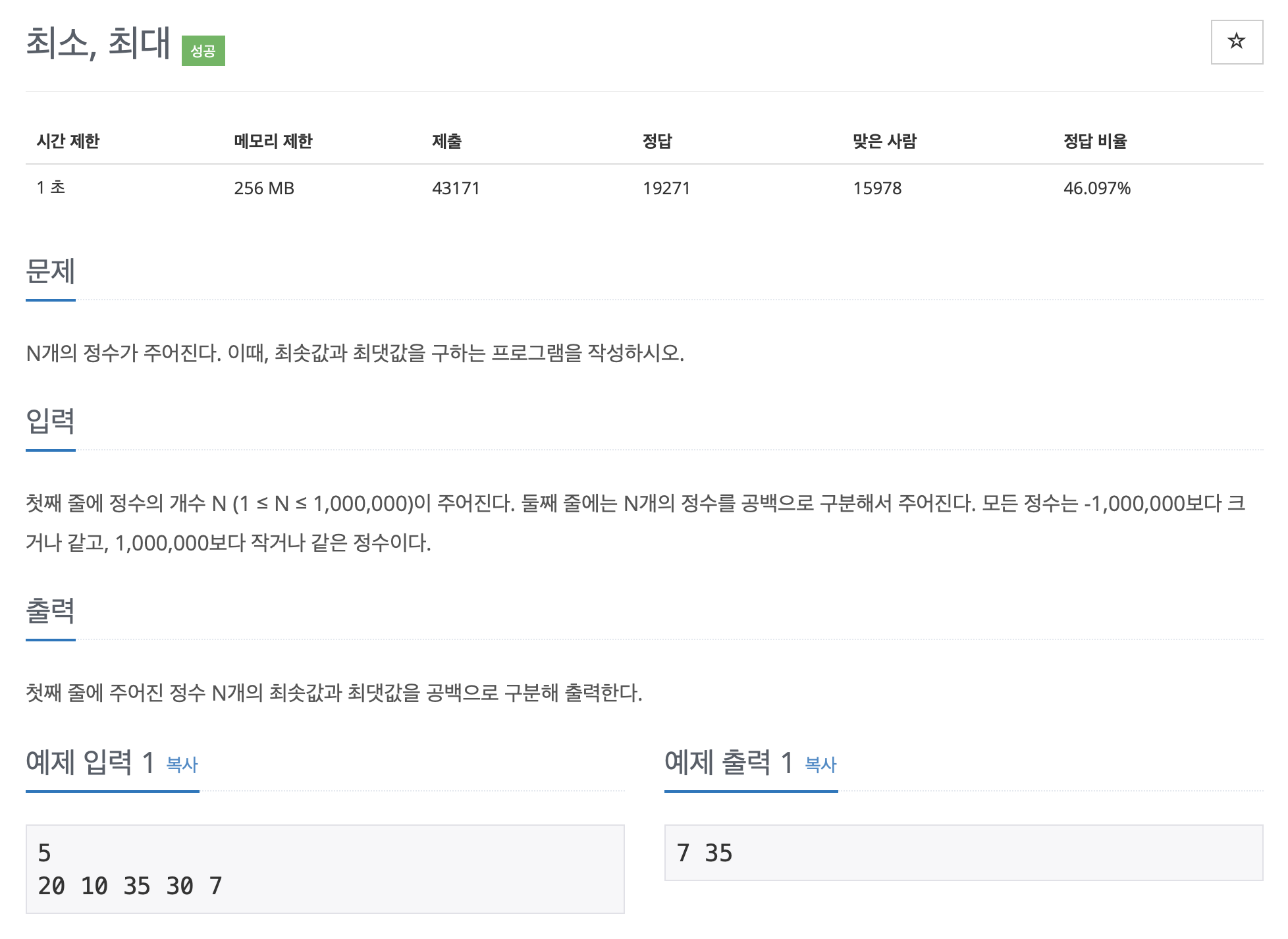 문제에서 모든 정수는 -1,000,000보다 크거나 같고, 1,000,000보다 작거나 같은 정수라고 되어있기 때문에 비교를 위해 max 에는 가장 작은 값으로, min 에는 가장 큰 값으로 초기화를 해준다.