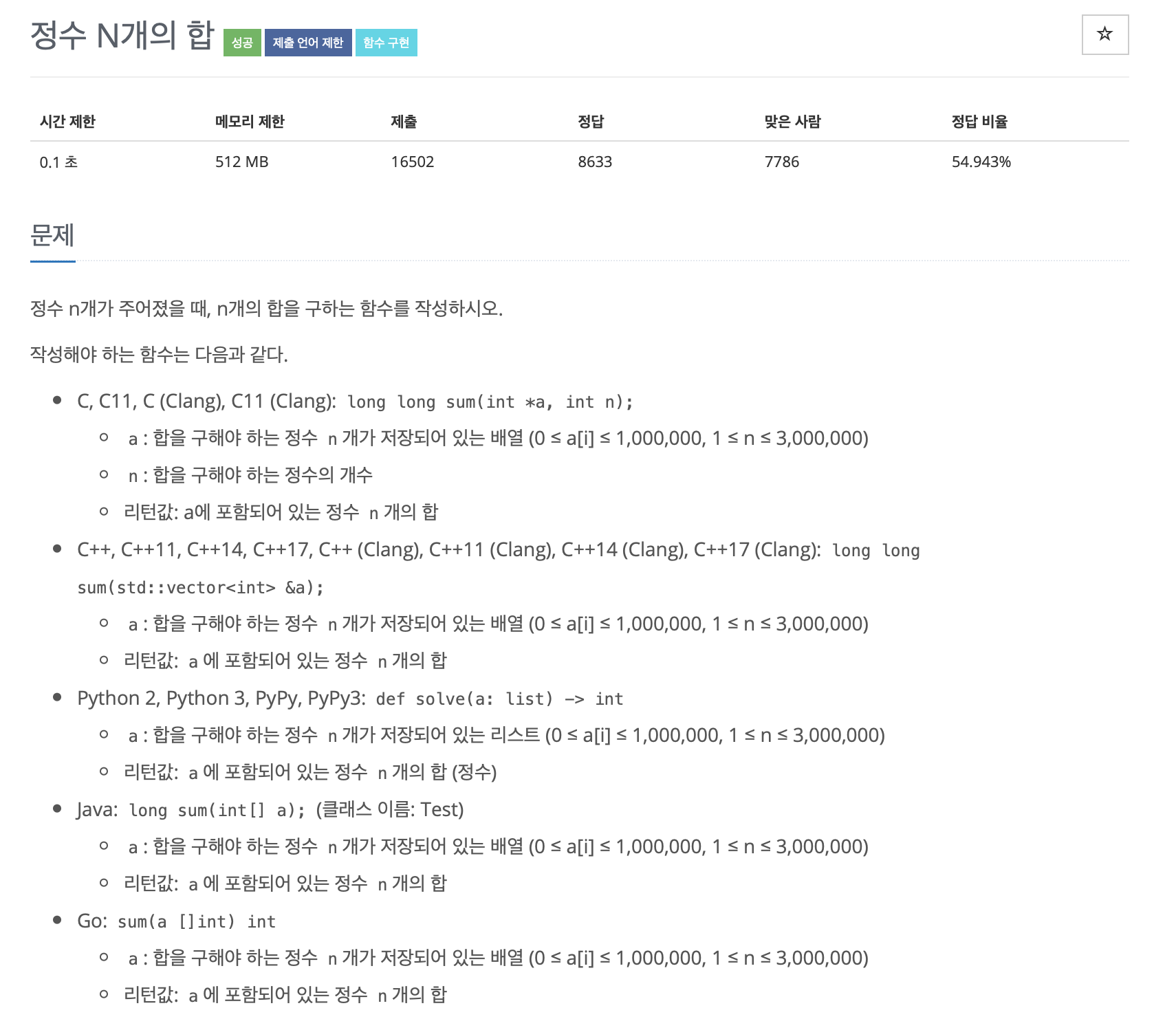 정수 n개가 주어졌을 때, n개의 합을 구하는 함수를 작성하시오. 작성해야 하는 함수는 다음과 같다. C, C11, C (Clang), C11 (Clang): long long sum(int *a, int n); a: 합을 구해야 하는 정수 n개가 저장되어 있는 배열 (0 ≤ a[i] ≤ 1,000,000, 1 ≤ n ≤ 3,000,000) n: 합을 구해야 하는 정수의 개수 리턴값: a에 포함되어 있는 정수 n개의 합 C++, C++11, C++14,