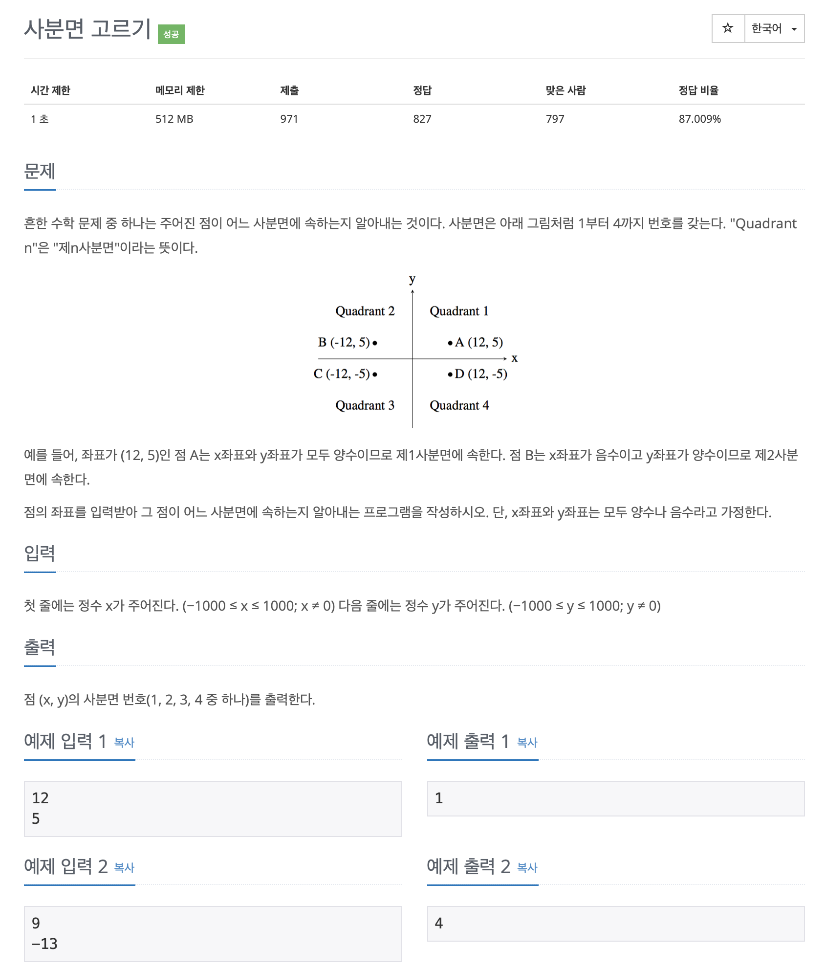 문제 흔한 수학 문제 중 하나는 주어진 점이 어느 사분면에 속하는지 알아내는 것이다. 사분면은 아래 그림처럼 1부터 4까지 번호를 갖는다. "Quadrant n"은 "제n사분면"이라는 뜻이다. 예를 들어, 좌표가 (12, 5)인 점 A는 x좌표와 y좌표가 모두 양수이므로 제1사분면에 속한다. 점 B는 x좌표가 음수이고 y좌표가 양수이므로 제2사분면에 속한다. 점의 좌표를 입력받아 그 점이 어느 사분면에 속하는지 알아내는 프로그램을 작성하시오. 단, x좌표