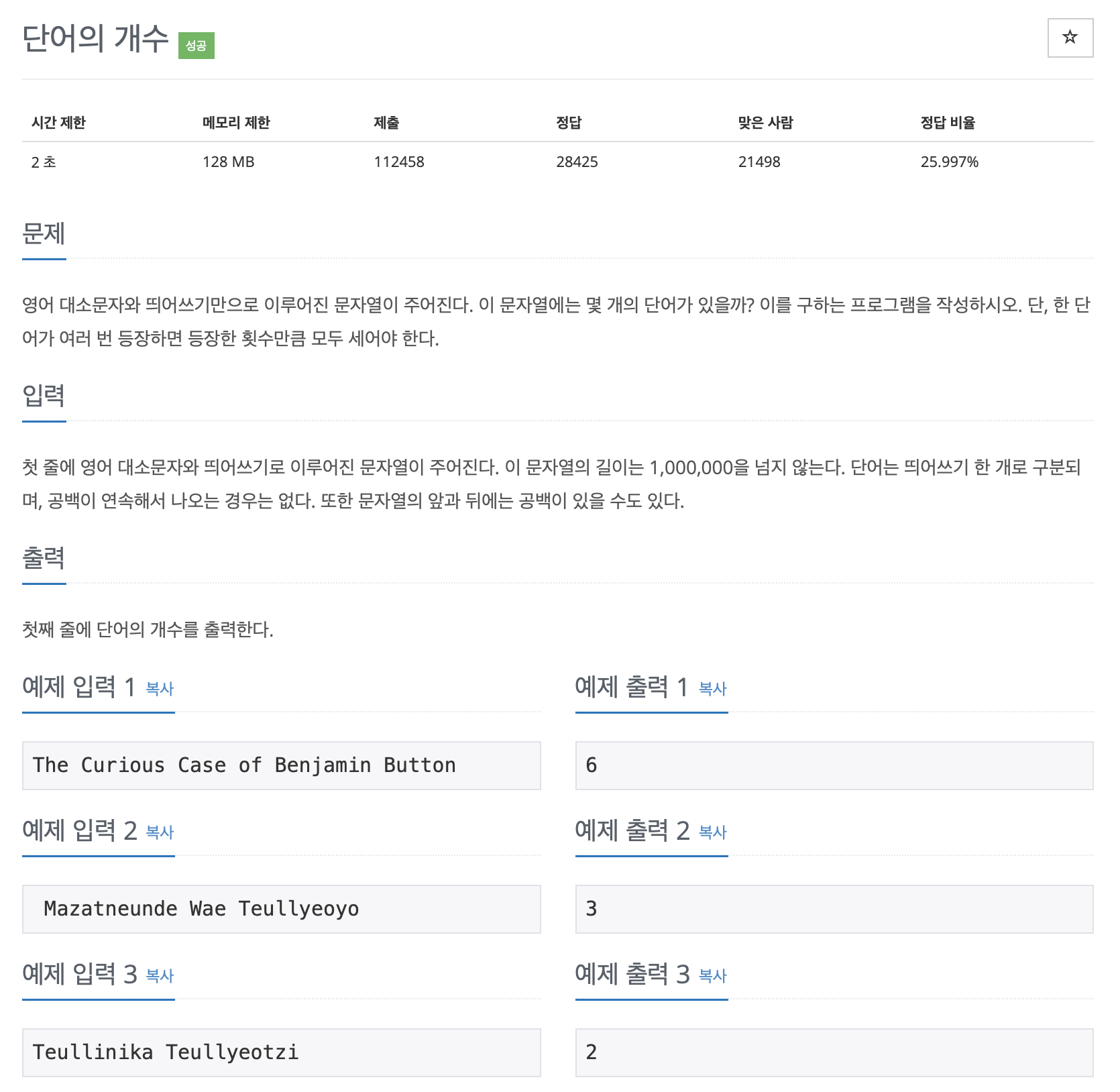 첫 줄에 영어 대소문자와 띄어쓰기로 이루어진 문자열이 주어진다. 이 문자열의 길이는 1,000,000을 넘지 않는다. 단어는 띄어쓰기 한 개로 구분되며, 공백이 연속해서 나오는 경우는 없다. 또한 문자열의 앞과 뒤에는 공백이 있을 수도 있다.