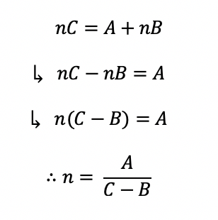 C 와 B 가 0에 가까워 질수록 식은 무한대에 가까워 진다. 즉, 0이게 되면 n 또한 무한대로 손익분기점이 발생하지 않게 된다.