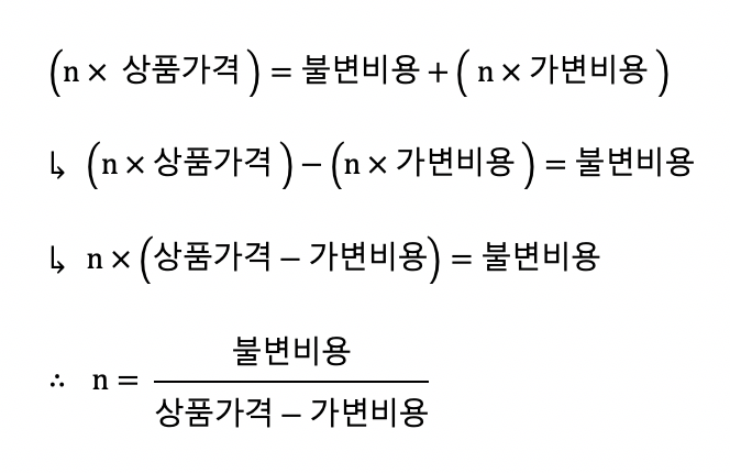위 공식이 바로 이익이 발생하는 판매량의 개수가 되는 것이다.