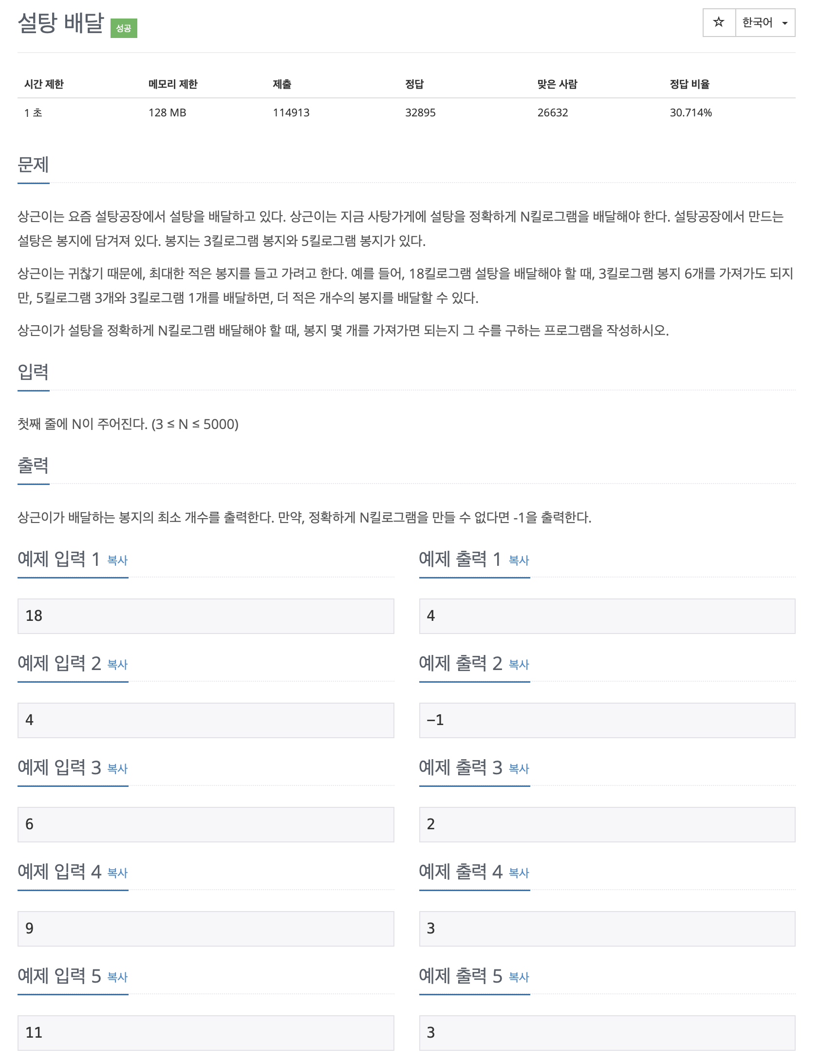 문제 상근이는 요즘 설탕공장에서 설탕을 배달하고 있다. 상근이는 지금 사탕가게에 설탕을 정확하게 N킬로그램을 배달해야 한다. 설탕공장에서 만드는 설탕은 봉지에 담겨져 있다. 봉지는 3킬로그램 봉지와 5킬로그램 봉지가 있다. 상근이는 귀찮기 때문에, 최대한 적은 봉지를 들고 가려고 한다. 예를 들어, 18킬로그램 설탕을 배달해야 할 때, 3킬로그램 봉지 6개를 가져가도 되지만, 5킬로그램 3개와 3킬로그램 1개를 배달하면, 더 적은 개수의 봉지를 배달할 수