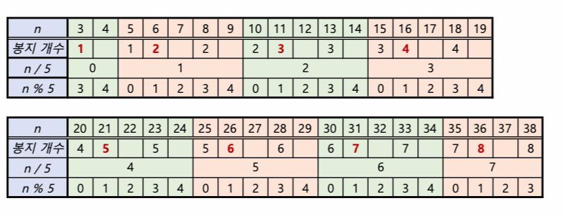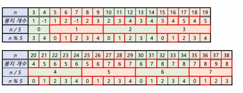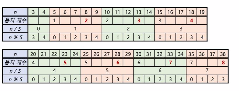 즉, (5의 배수 + 1) 과 (5의 배수+ 3) 은 5로 나눈 몫의 + 1 이 봉지 개수가 되는 것이다.