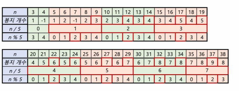 즉, n = 9 부터 +5 씩 증가할 때마다 봉지의 개수는 3 에서 1 씩 증가하는 것이다.