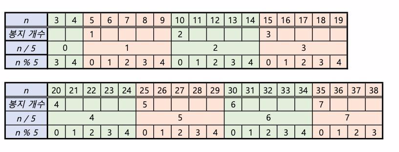 < 5의 배수 + 1 번째 >의 봉투의 개수는 (n / 5) + (n % 5) 이다.