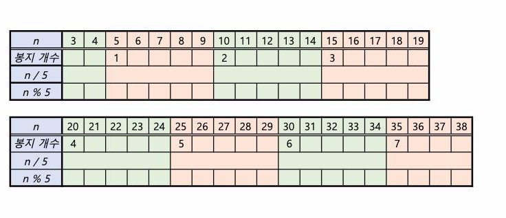 < 5의 배수 + 2 번째 >의 봉투의 개수는 (n / 5) + (n % 5) 이다.