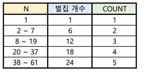 그리고 N 까지 가는 몇가지 경우를 세어보면 알겠지만 N 이 속해있는 겹에 있는 수들은 모두 최소 루트의 방 방문 수는 같다.
