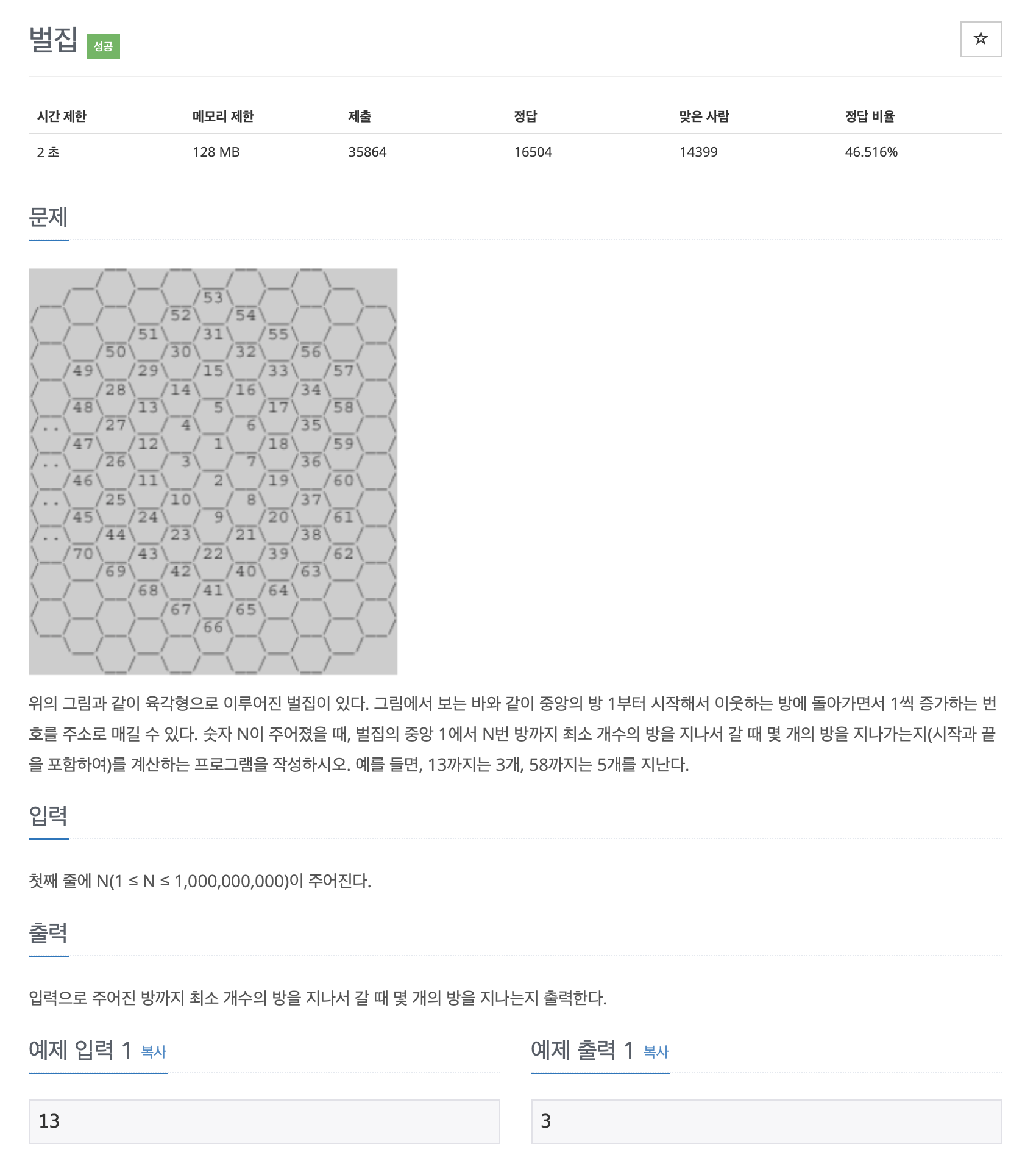 위의 그림과 같이 육각형으로 이루어진 벌집이 있다. 그림에서 보는 바와 같이 중앙의 방 1부터 시작해서 이웃하는 방에 돌아가면서 1씩 증가하는 번호를 주소로 매길 수 있다. 숫자 N이 주어졌을 때, 벌집의 중앙 1에서 N번 방까지 최소 개수의 방을 지나서 갈 때 몇 개의 방을 지나가는지(시작과 끝을 포함하여)를 계산하는 프로그램을 작성하시오. 예를 들면, 13까지는 3개, 58까지는 5개를 지난다.