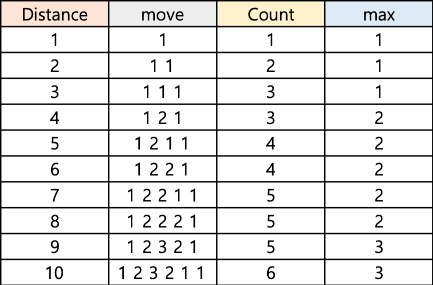 - Distance(거리) 는 이전 거리와 최댓값과의 차이가 max 가 증가하는 규칙과 동일하다.