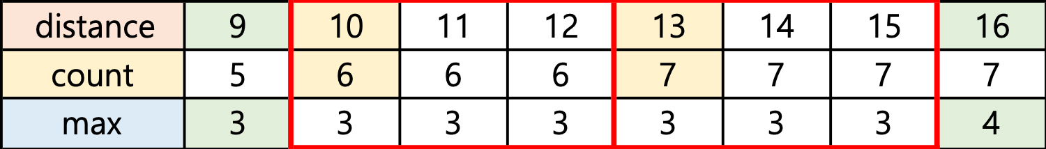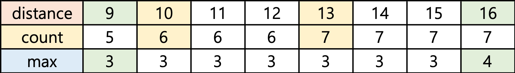 그러면 Count 를 기준으로 최대 거리를 한 번 표로 만들어보자.