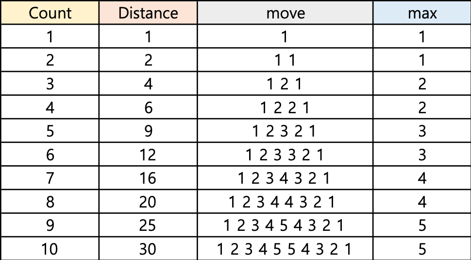 Count 값에 따라 이동할 수 있는 최대 거리를 나열해보니 규칙이 세 가지 보인다.
