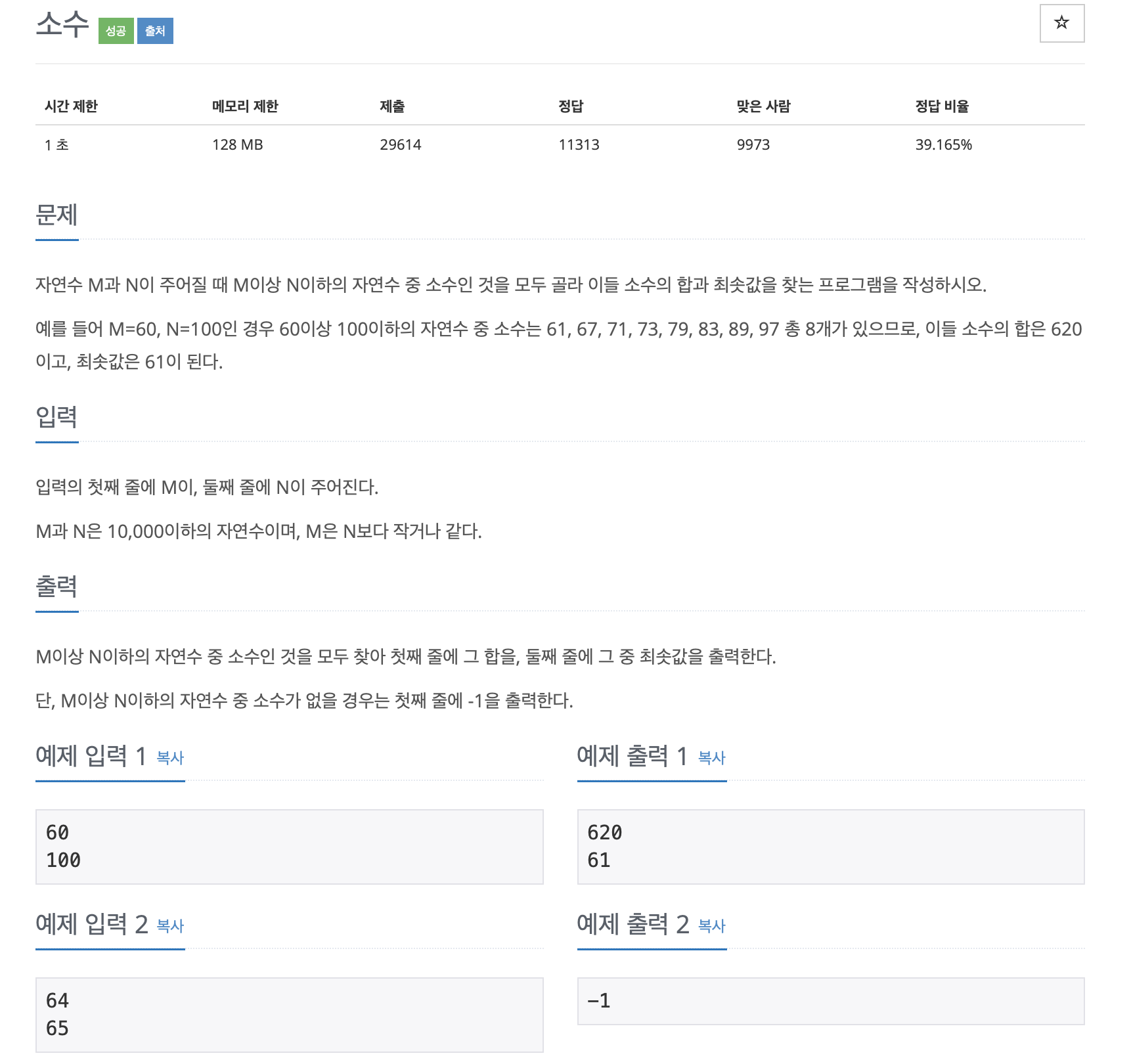 M이상 N이하의 자연수 중 소수인 것을 모두 찾아 첫째 줄에 그 합을, 둘째 줄에 그 중 최솟값을 출력한다. 단, M이상 N이하의 자연수 중 소수가 없을 경우는 첫째 줄에 -1을 출력한다.