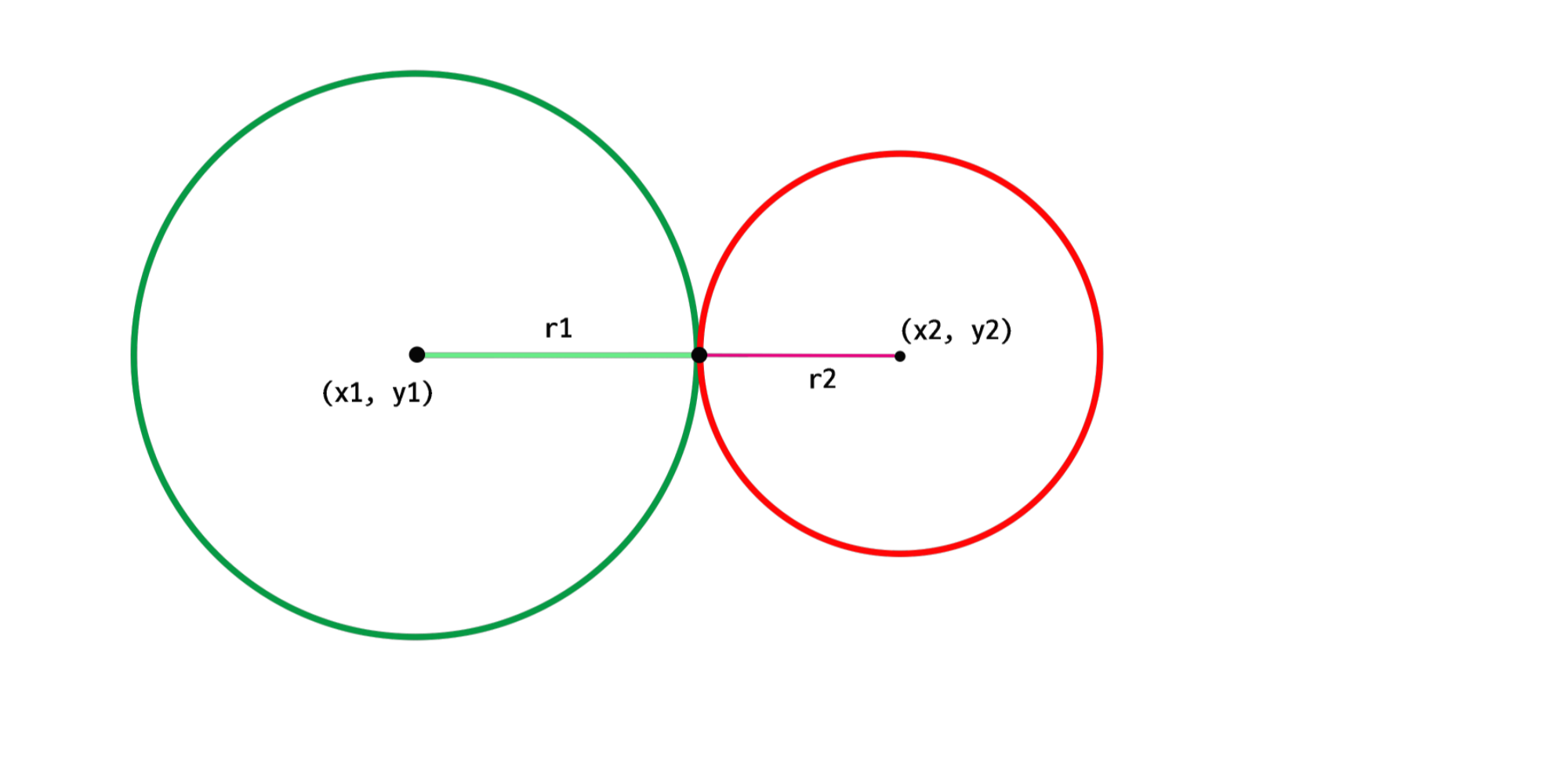 좀 더 쉽게 풀면 (𝑥₂ - 𝑥₁)² + (𝑦₂ - 𝑦₁)² = (𝑟₂ + 𝑟₁)²