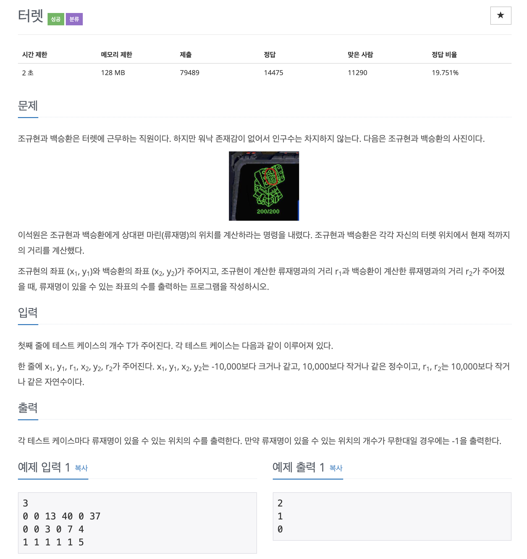[백준] 1002번 : 터렛 - JAVA [자바]