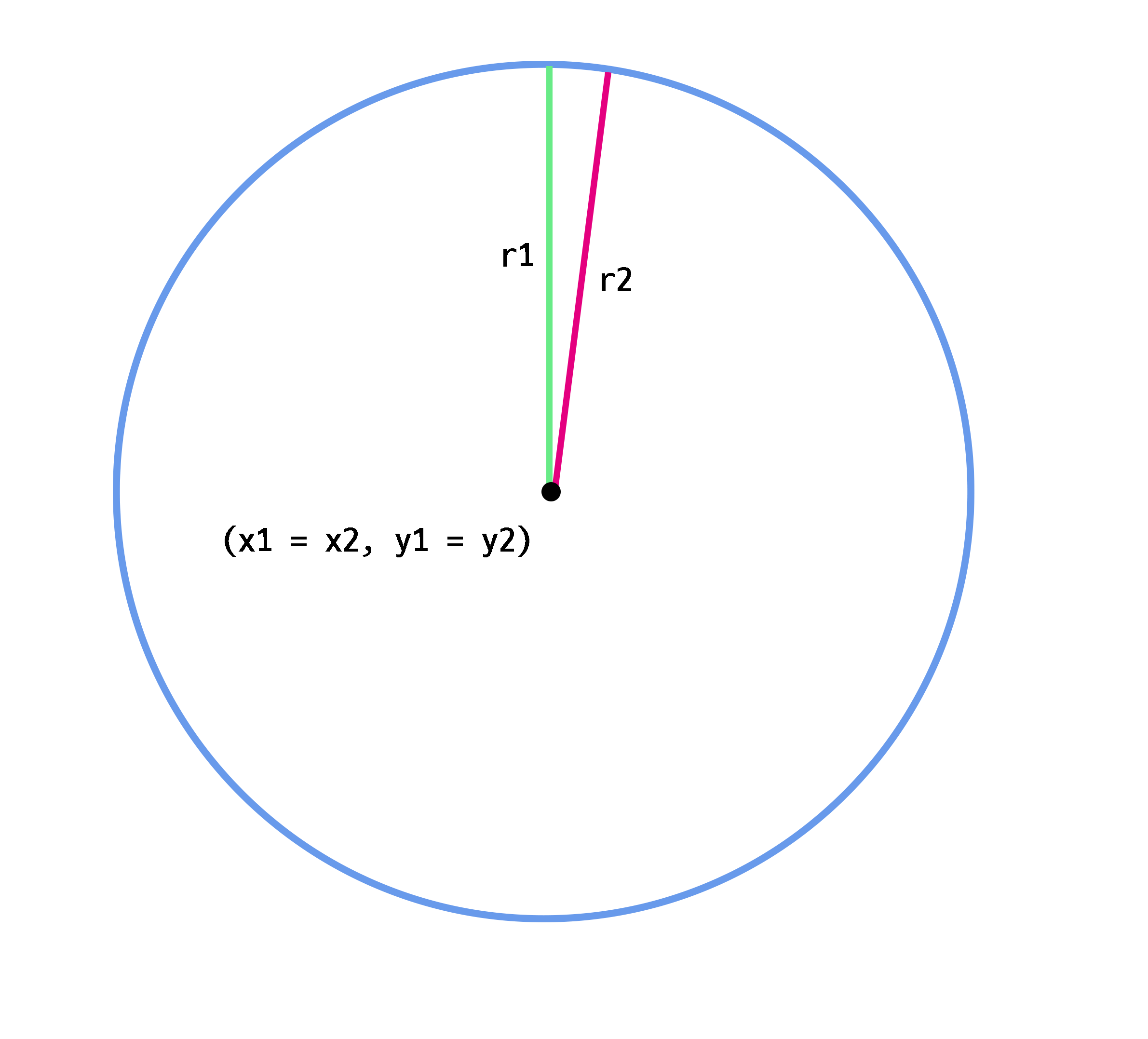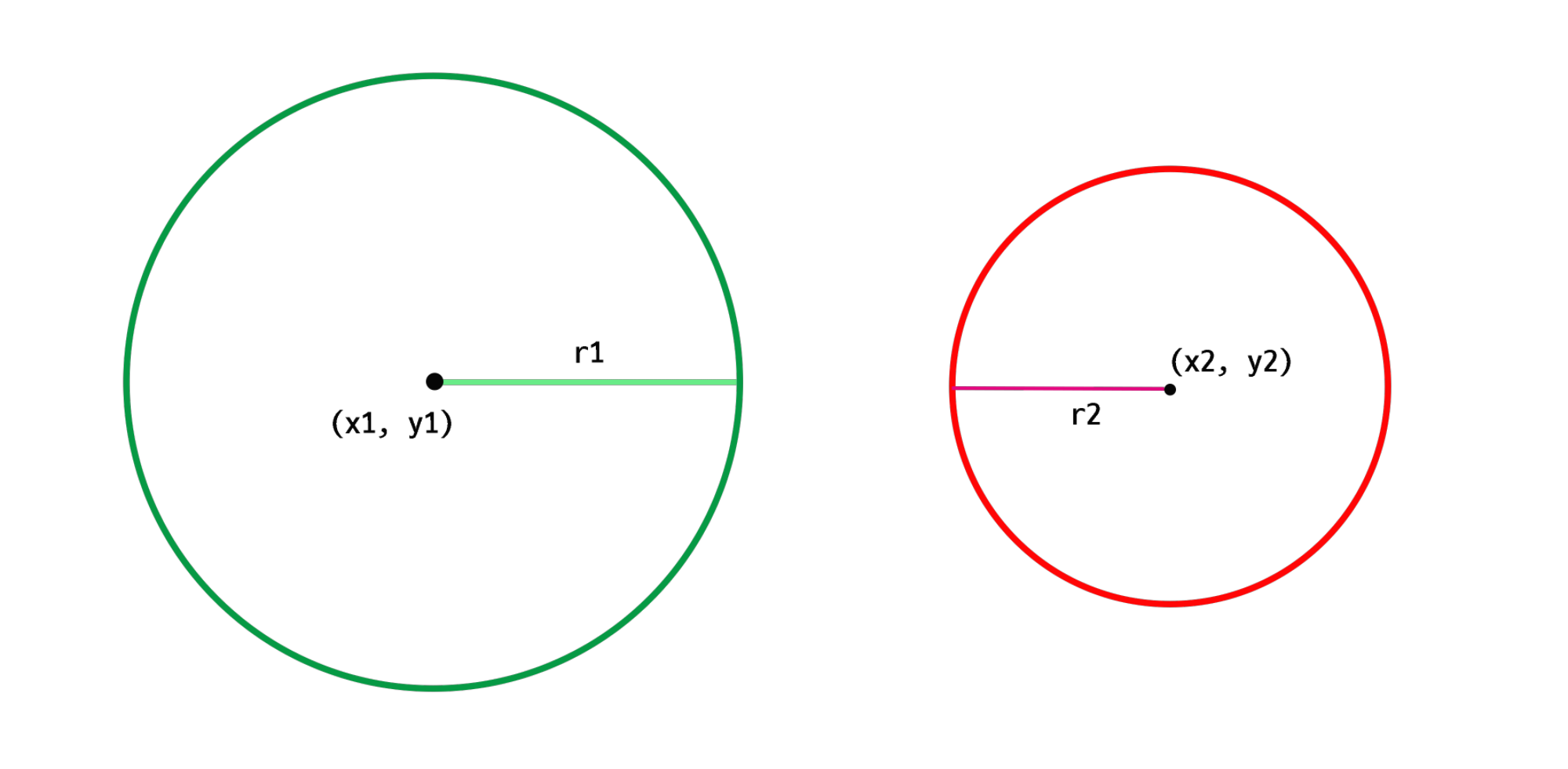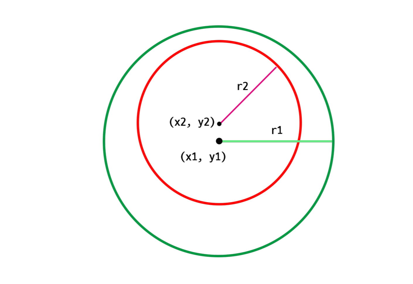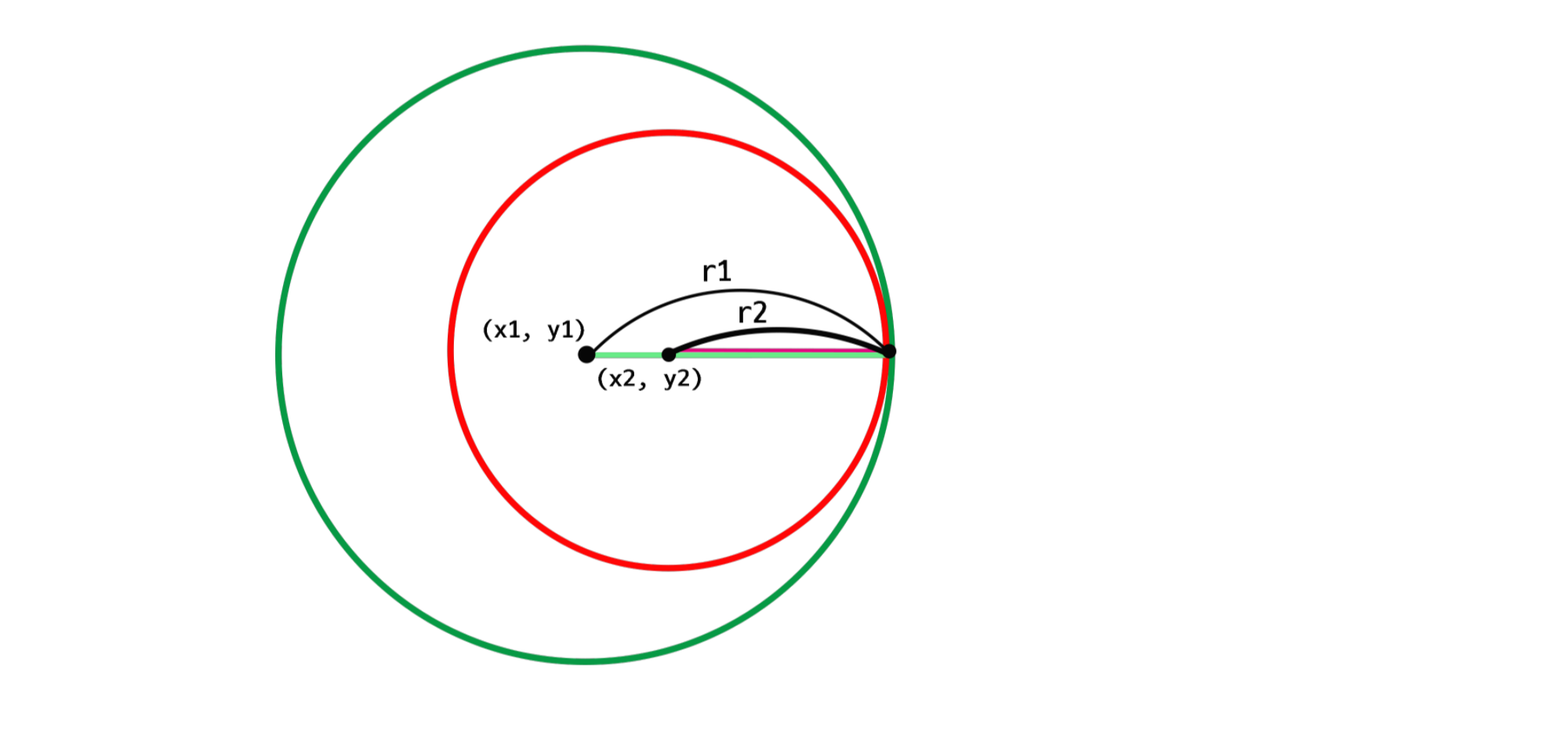 초록색 원과 빨간색 원이 아래와 같을 때, 접점을 갖지 않으려면 반지름이 같지 않으면서 반지름의 차가 두 원간의 중점 거리보다 크면 된다.