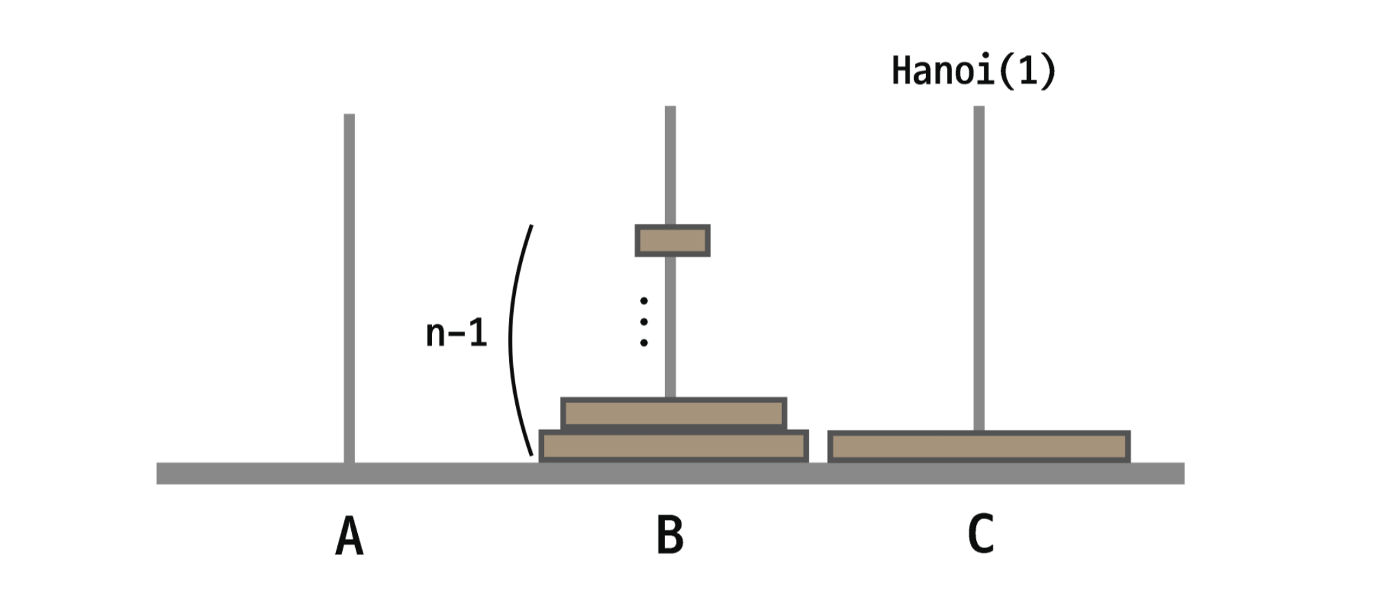 앞서 A 에서 B 로 n-1 개가 이동했듯이, B 에서 C 로 이동하는 횟수는 Hanoi(n-1) 가 된다.